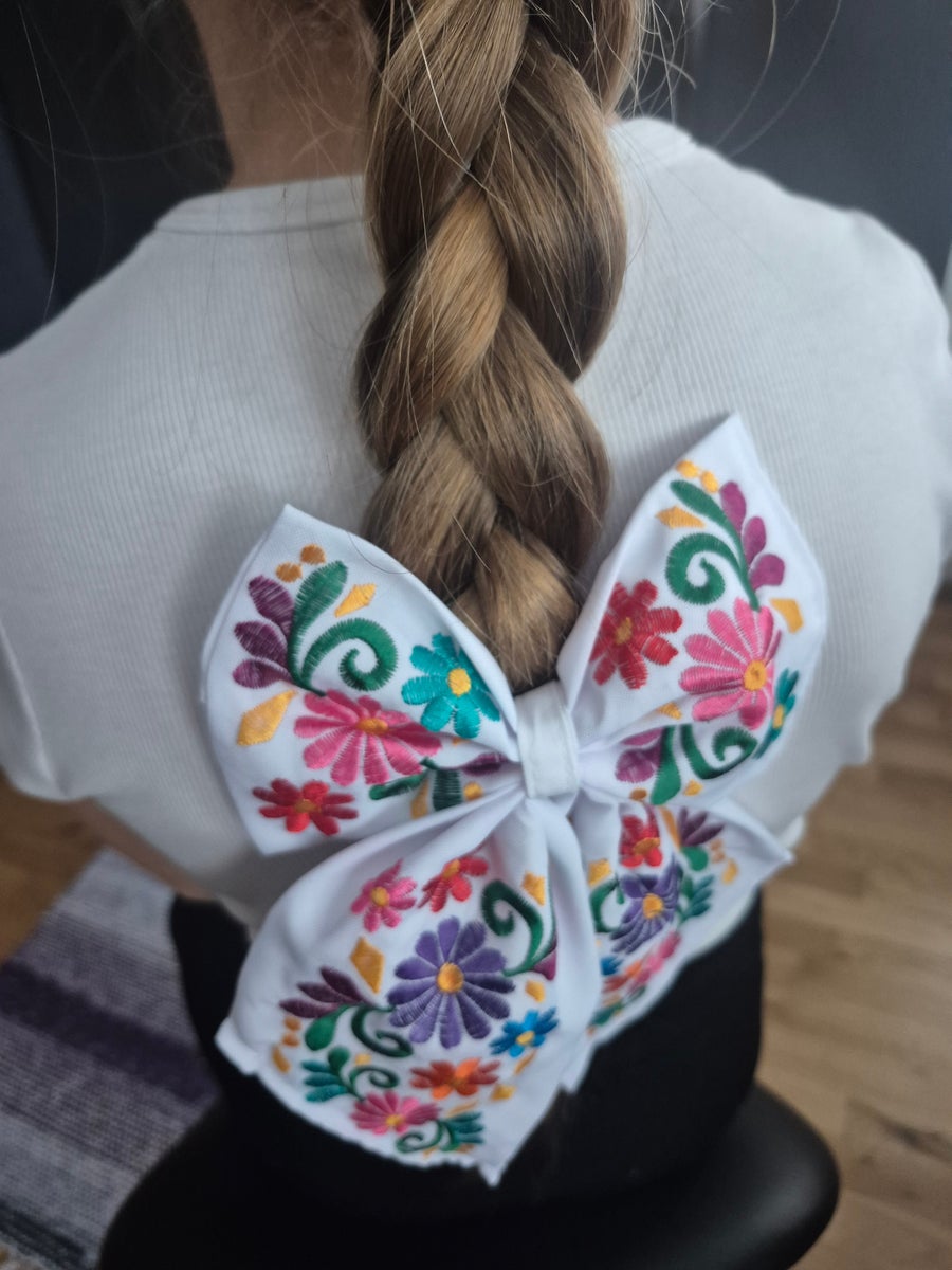 Tutustu meksikolaisen käsityön taiteeseen ja viehätysvoimaan ainutlaatuisilla ruseteilla, jotka tuovat väriä ja iloa hiustyylisi! Jokaisessa rusetissa on näyttävä kukkakirjonta. Kuosit vaihtelevat, joten jokainen rusetti on oma ainutlaatuinen taideteoksensa. Olipa kyseessä juhlat, arkipäivä tai erityinen tilaisuus, nämä rusetit ovat täydellinen lisä asusteeseesi. Klipsikiinnitys, kiinnitä esimerkiksi hiuksiin, laukkuun, vyöhön ym.
