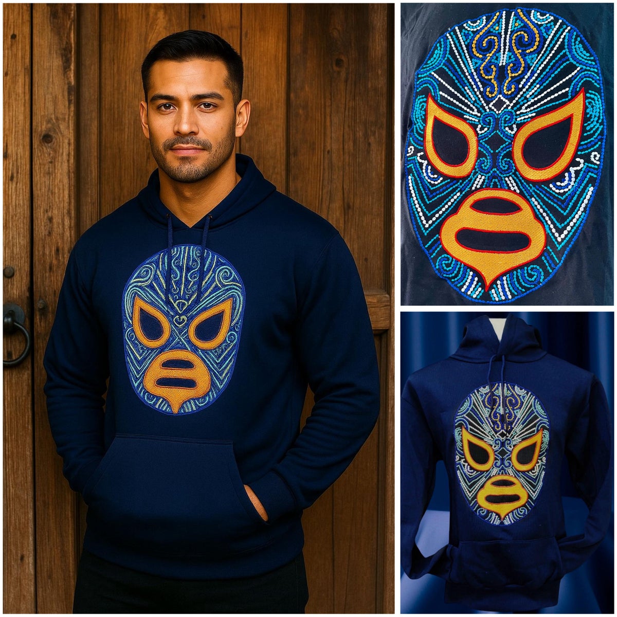 Sininen Lucha Libre huppari on varustettu näyttävällä Meksikolaisen Luchador-painijan naamiolla. Kirjailtu Luchador Mask-kuvio on saanut innoituksensa meksikolaisesta vapaapainista.
